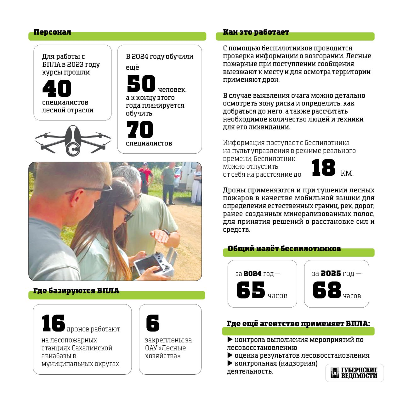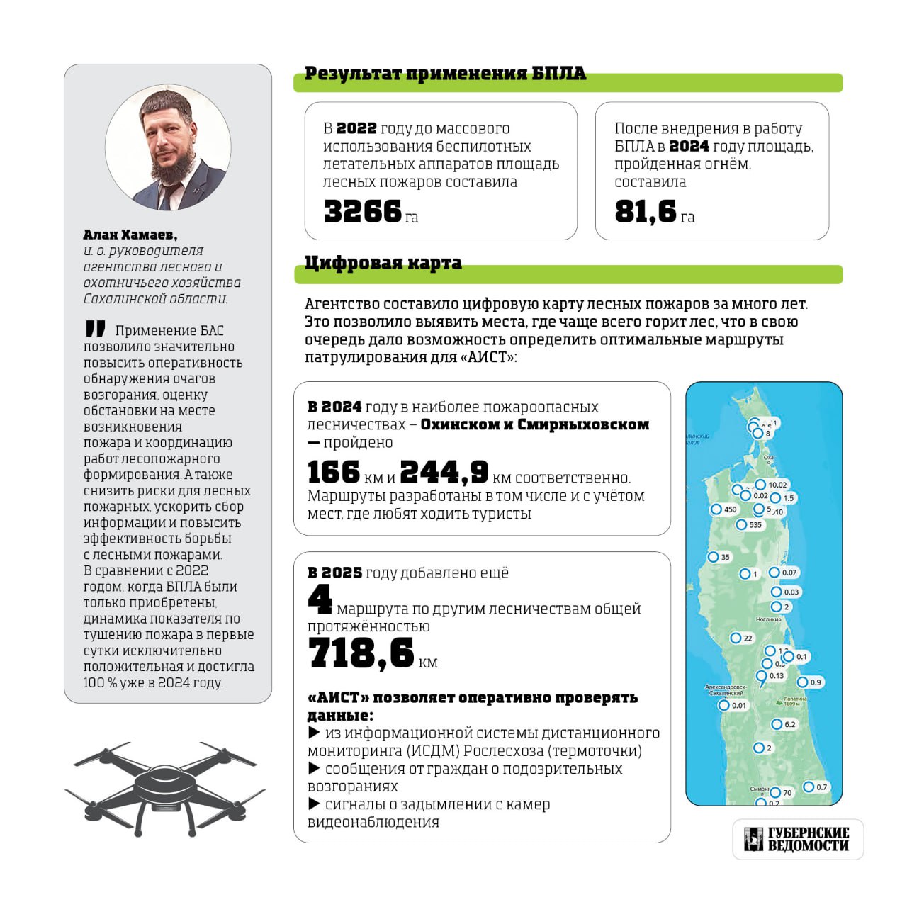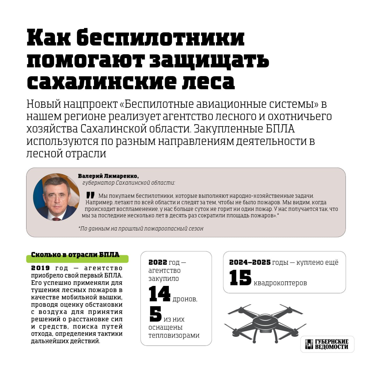 Новый нацпроект «Беспилотные авиационные системы» в нашем регионе реализует агентство лесного и охотничьего хозяйства Сахалинской области. Закупленные БПЛА используются по разным направлениям деятельности в лесной отрасли.