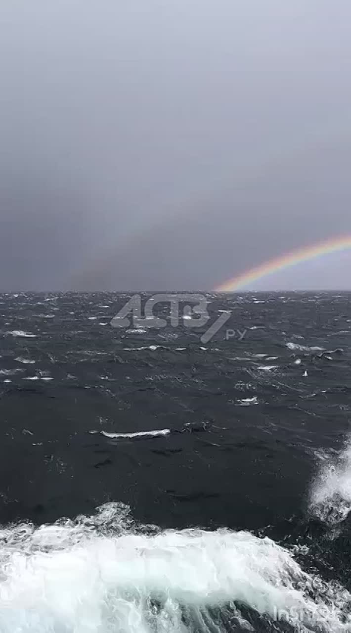 Экипаж судна на Курилах запечатлел фантастическую радугу над бушующим морем