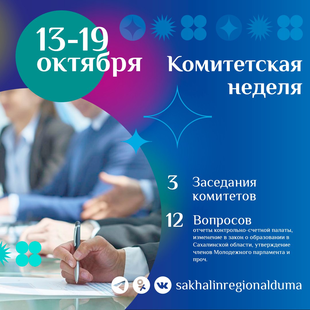 - Отчет контрольно-счетной палаты Сахалинской области о проверке расходования средств по программе «Развитие внутреннего и въездного туризма в Сахалинской области» и ведомственного проекта «Государственная поддержка в сфере туризма в Сахалинской области» за 2023–2025 годы обсудят депутаты на совместном комитете по бюджету и налогам, спорту, туризму и молодежной политике;