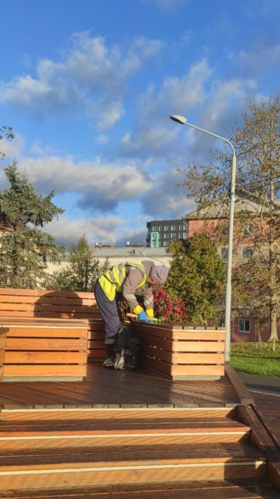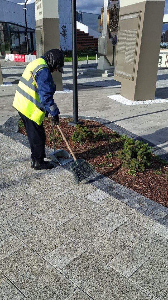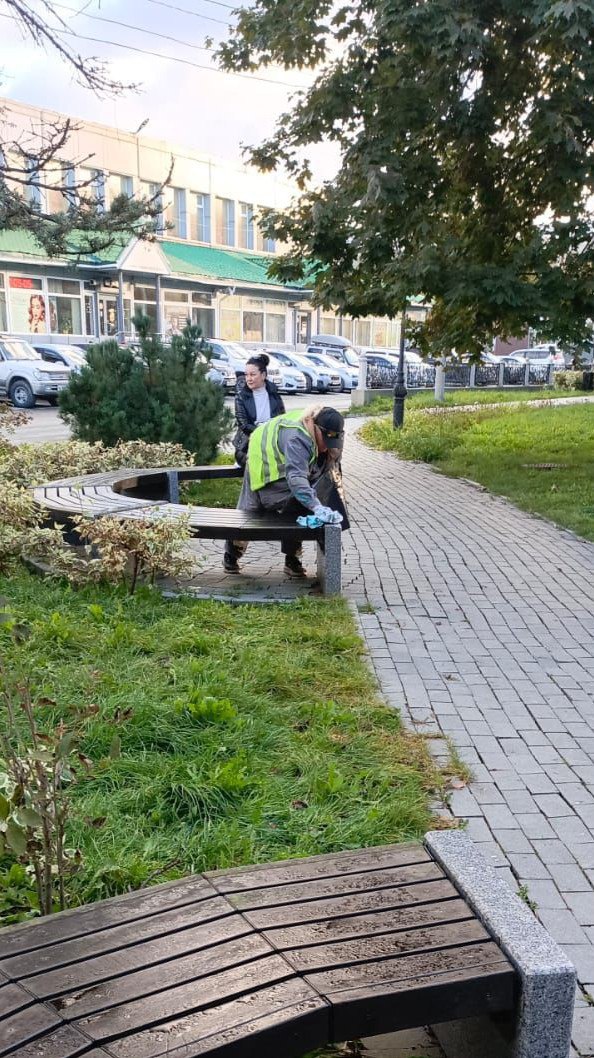 В этот понедельник бригады убирали мусор в скверах и на клумбах, подметали пешеходные дорожки, протирали поверхностей скамеек, МАФов, и памятников, косили газон на Коммунистический проспекте.