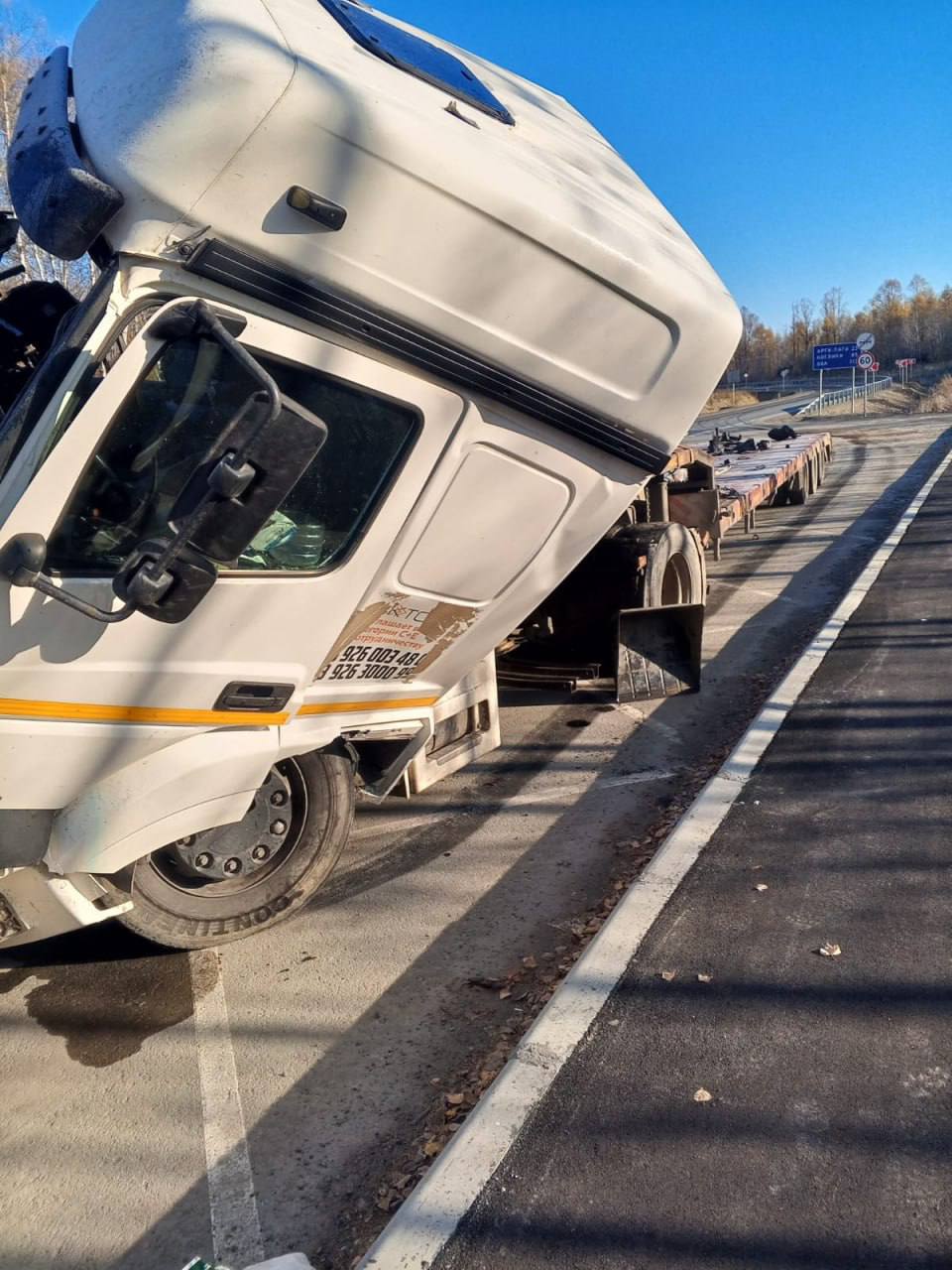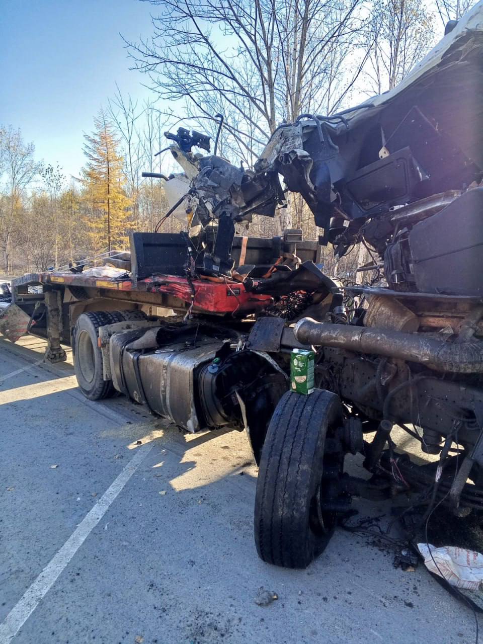 Очевидцы сообщают, что недалеко от Адо-Тымово столкнулись лесовоз "Урал" и трал. У последнего кабина вдребезги, и он далеко укатился по трассе от второго участника ДТП.