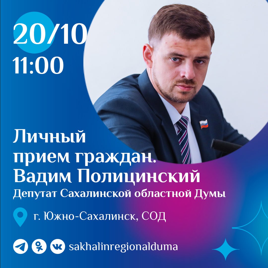 20 октября 2025 года с 11:00 заместитель председателя постоянного комитета Сахалинской областной Думы по социальной политике Вадим Полицинский проведет личный прием граждан