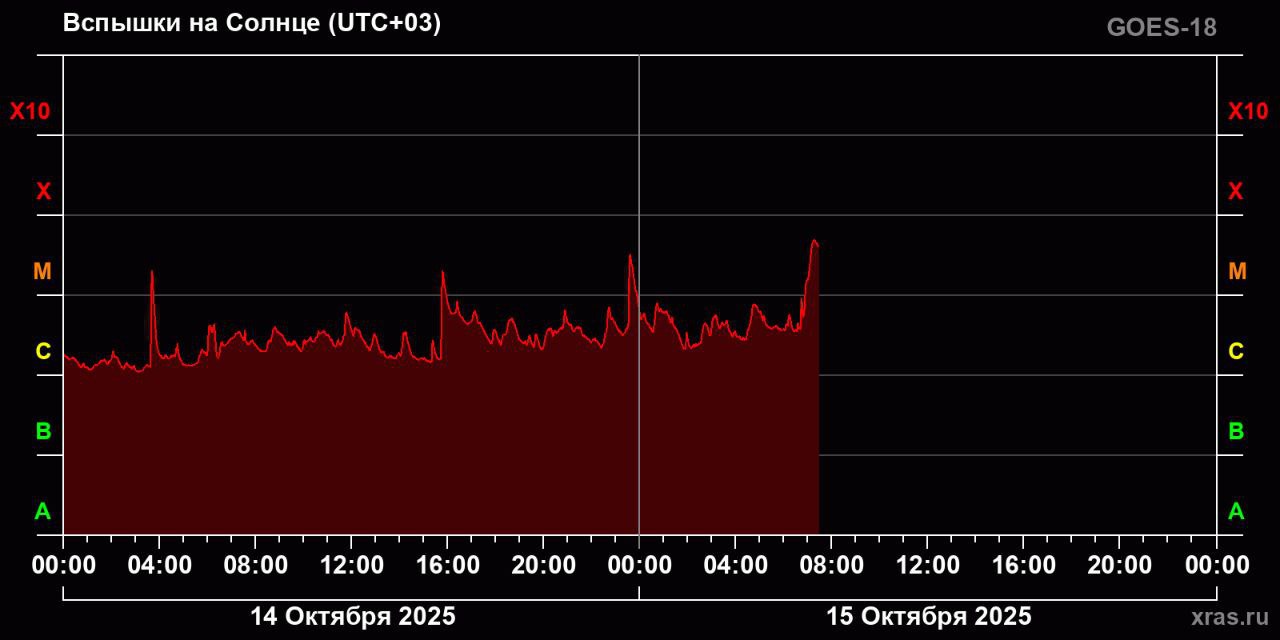 "Графики показывают непрерывный рост фонового излучения Солнца, которое за сутки выросло в 4 раза и приближается к уровню М. Иными словами, Солнце в данный момент даже в отсутствие взрывов формирует потоки рентгеновского излучения на уровне сильных вспышек", — пишут учёные.