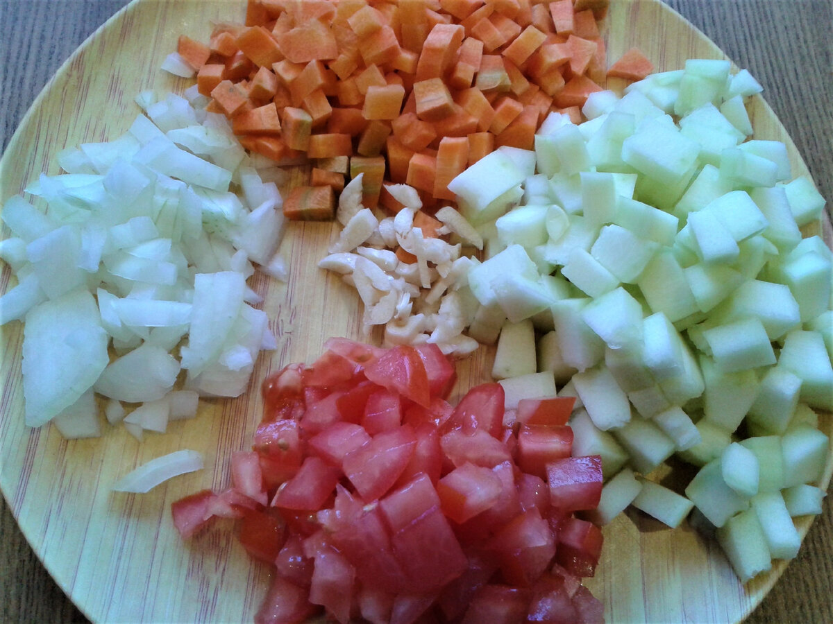 Начинается все с разогрева растительного масла в кастрюле. На нем пассеруются мелко нарезанные морковь и лук до мягкости. Спустя несколько минут добавляется нарезанный томат и чеснок, который дает блюду аромат. Эта смесь тушится пару минут до появления легкого аромата.