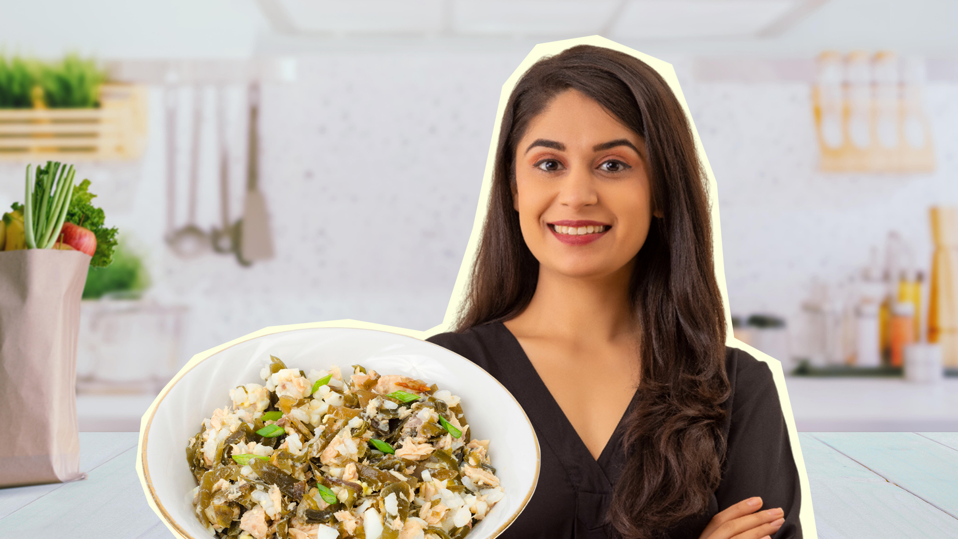 Рыбу и яйца предварительно отварите. Затем нарежьте их кубиками. Лук мелко порубите. При необходимости измельчите морскую капусту.
