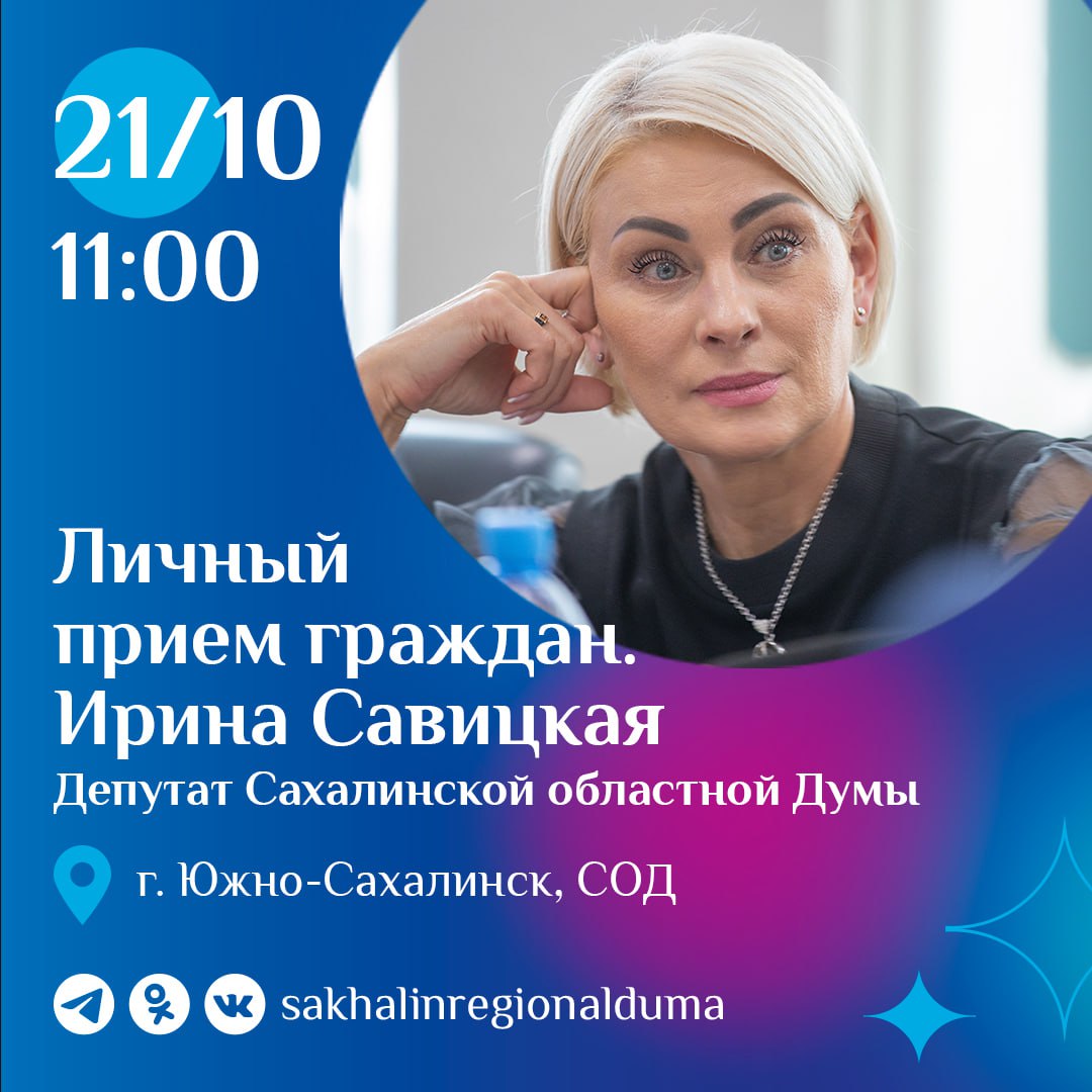 21 октября с 11:00 депутат Сахалинской областной Думы Ирина Савицкая проведет личный прием граждан