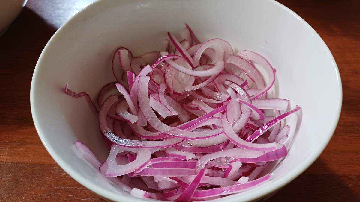 Первый шаг к идеальному салату — замариновать репчатый лук. Для этого нарезанный полукольцами лук смешивается с уксусом и сахаром, после чего оставляют на некоторое время, чтобы он пропитался ароматами.
