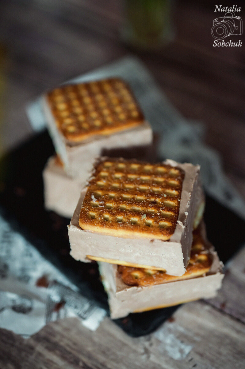 Важно взбить шоколадные сливки до мягких пиков, чтобы масса стала густой, но не держала форму. На дно подготовленного контейнера выложить песочное печенье, затем вылить шоколадную массу и разровнять ровным слоем. Сверху снова уложить печенье, следя за тем, чтобы оно было на одном уровне. Отправить будущее мороженое в морозильник и оставить минимум на 6-8 часов. После этого, нарезать готовое мороженое на аккуратные сэндвичи и наслаждаться неимоверным вкусом собственного десерта!