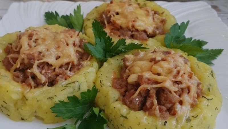 Картофельные гнёзда с фаршем без сомнений станут украшением семейного стола. Сочетание нежного картофельного пюре, ароматной мясной начинки и расплавленного золотистого сыра создаёт неповторимый гармоничный вкус.