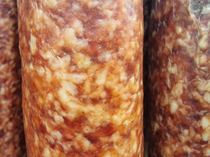 После того как специи добавлены, мясо перемешивают руками до полного распределения приправ по всему объему. Затем полученную массу выкладывают в марлину или другую форму для колбасы и оставляют на несколько часов в прохладном месте для насыщения вкуса.