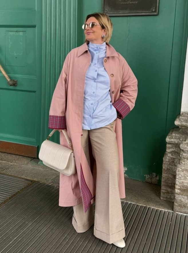 - Динамика бежевого и голубого. Расклешенные брюки песочного оттенка с стрелками отлично сочетаются с классической бледно-голубой рубашкой и длинным розовым пальто в клетку. Это ансамбль добавит утонченности и элегантности вашему образу.