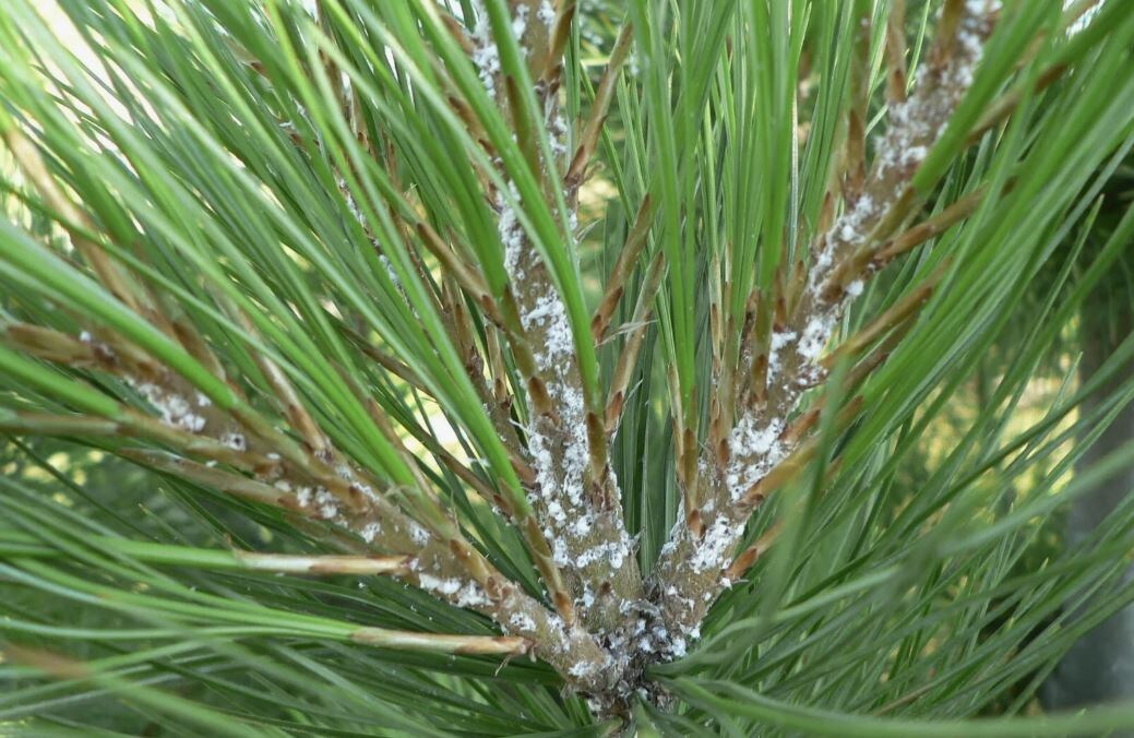 - Белый налет на хвое и молодых побегах – это защитные выделения личинок.