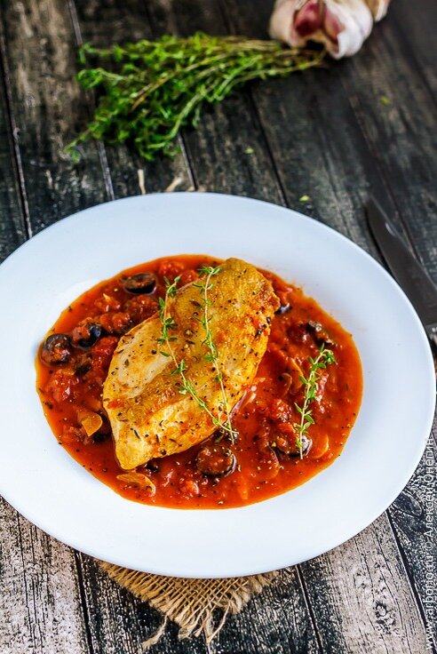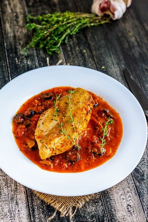 В этой части процесса сосредоточьтесь на создании соуса, который станет настоящим акцентом блюда. В ту же сковороду добавьте нарезанные помидоры и чеснок, обжарьте до мягкости. Затем введите анчоусы, оливки, вино, бульон, тимьян и лавровый лист. Позвольте смесь подрумяниться на среднем огне, затем томите до желаемой консистенции. Добавьте в конце сливочное масло для дополнительной нежности и аромата.