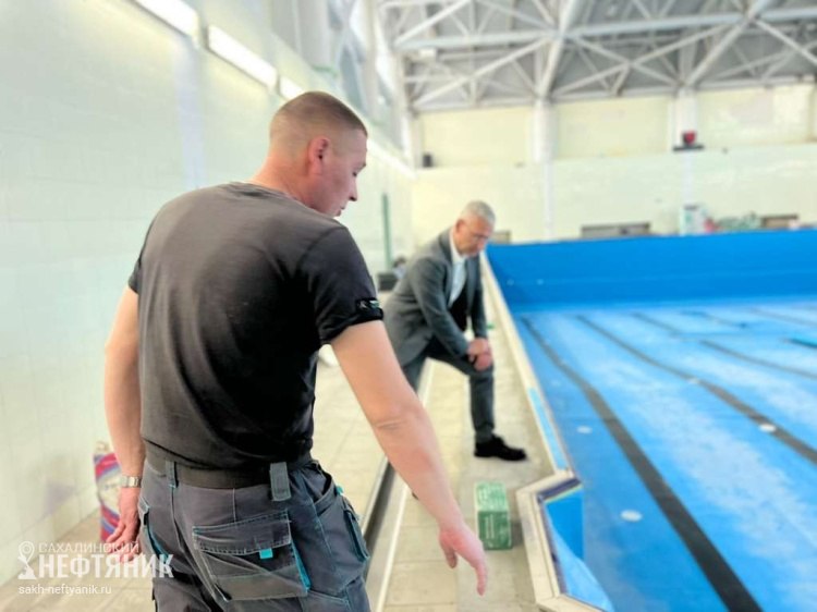 «Сегодня мы уже видим результат» – мэр Охи проверил ремонт бассейна в «Дельфине»
