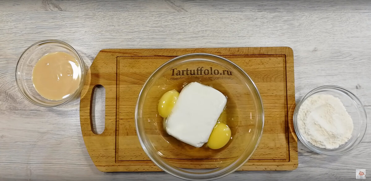 Для начала необходимо подготовить тесто для коржей. В глубокой миске соедините 180 граммов пастообразного творога с двумя куриными яйцами и щепоткой соли. Затем добавьте 100 граммов сгущенного молока и тщательно перемешайте венчиком до получения однородной массы.