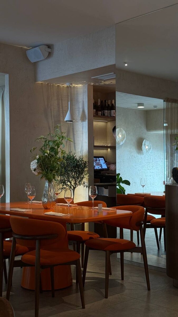 Интерьер Teya реализует концепцию бистро с лаконичными формами и спокойными бежевыми оттенками, которые освежаются ярким акцентом в виде центрального стола. Заведение небольшое, но уютное, что делает его идеальным для дружеских встреч или обедов в компании.