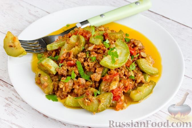 - Кабачки, тушенные с фаршем и помидорами: Это простое, но сытное блюдо станет настоящей находкой для обеда. Яркий вкус помидоров в сочетании с сочным фаршем делает его невероятно аппетитным.