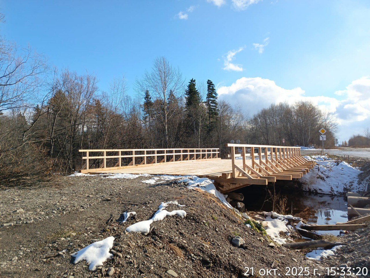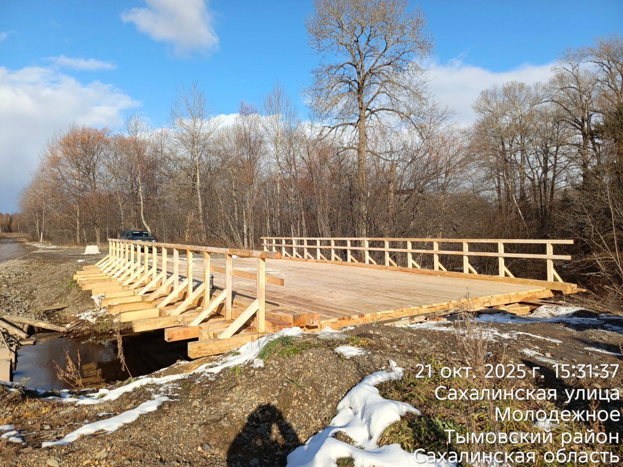 Подрядчик – АО «Тымовское ДРСУ» – завершил основные строительно-монтажные работы, сообщают в минтрансе региона. Сейчас дорожники делают подъездные пути к мосту. Ожидается, что движение по нему запустят до конца этой недели.