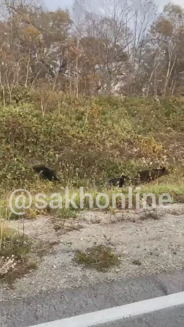 Жители Кунашира наткнулись на косолапую семью 22 октября около 18 часов вечера. По словам очевидцев, мишки брели вдоль дороги очень близко к Южно-Курильску, практически в черте поселка.