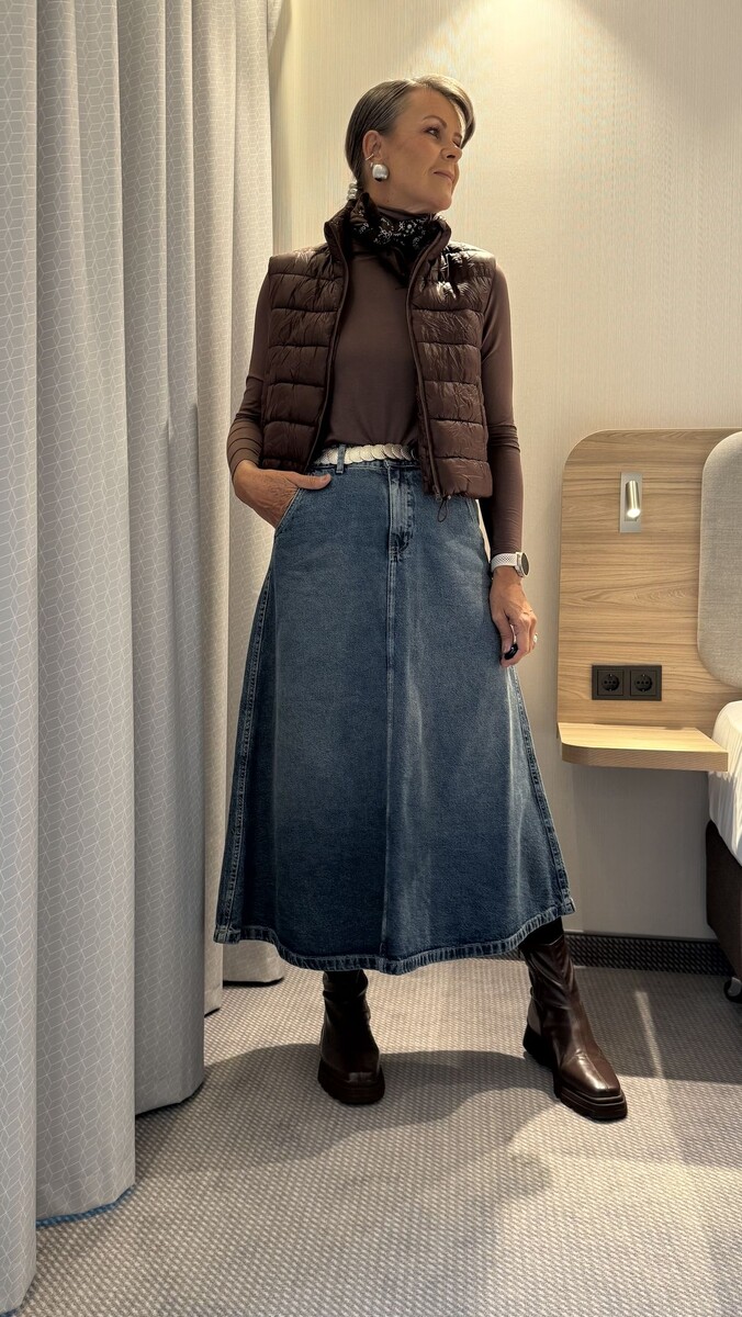 - Синяя джинсовая юбка-трапеция: В сочетании с тёмно-серой водолазкой и классическим пальто верблюжьего цвета, Silhouette выглядит изысканно и сдержанно, что подчеркивает стилизованный джинсовый элемент.