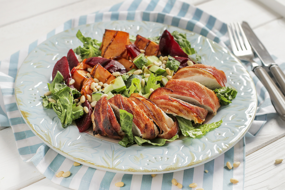 Существует множество способов порадовать себя и своих близких с помощью вкусной и полезной еды. Этот салат с индейкой, завернутой в бекон, бататом, свеклой и кедровыми орехами, станет настоящим украшением любого стола. Он буквально излучает цвет и вкус, а его ингредиенты поднимают настроение не только своему обладателю, но и тем, кто решит его отведать.