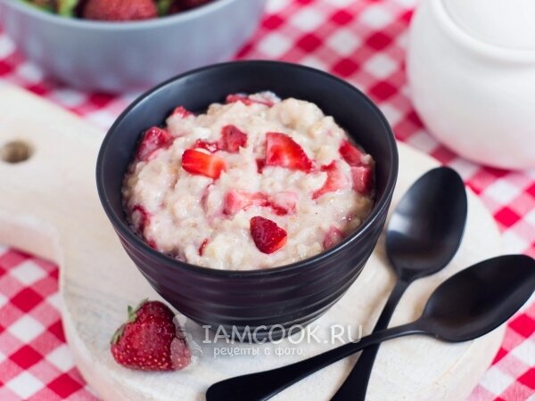 - Овсянка с клубникой: Завтрак, который не только насытит, но и подарит позитивное настроение на весь день. Для этого потребуется 60 г овсяных хлопьев, 300 мл молока, 1 ст. л. сахара, 80 г клубники, а также щепотка соли и немного ванильного сахара. Готовить всего 25 минут, а калорийность составит около 117 ккал.