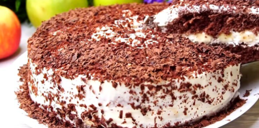 После того как корж остынет, аккуратно разрежьте его на две половины. Приготовьте крем: смешайте сметану с сахарной пудрой. На первый корж нанесите крем, добавьте кружочки банана, затем накройте вторым коржом и украсьте по желанию. Такой торт не только быстро готовится, но и удивляет необычным сочетанием вкусов. Приятного аппетита!