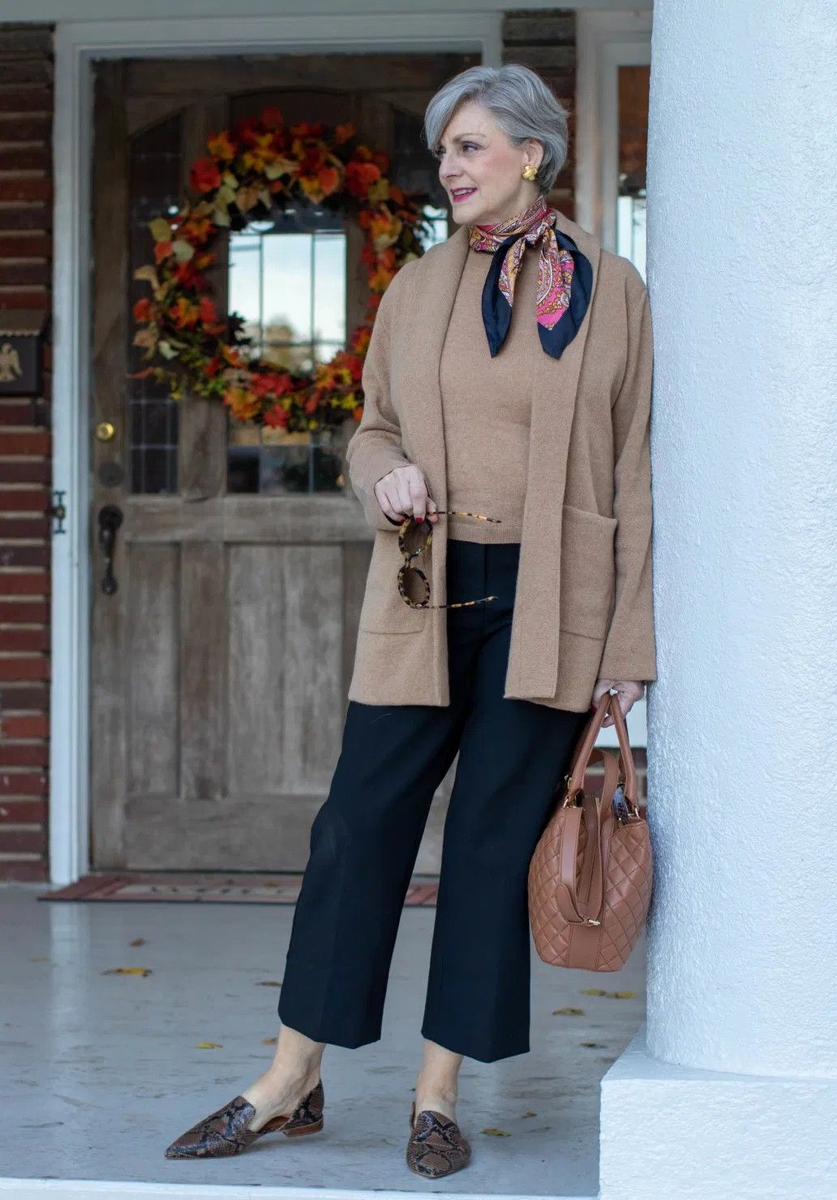 - Негромкие цвета: для любительниц минимализма подойдет образ из черных брюк, туфель на низком каблуке и серого джемпера с объемными рукавами. Аксессуары могут включать серьги-гвоздики и цепочку с подвеской, а черная сумка из лакированной кожи станет изысканным акцентом.
