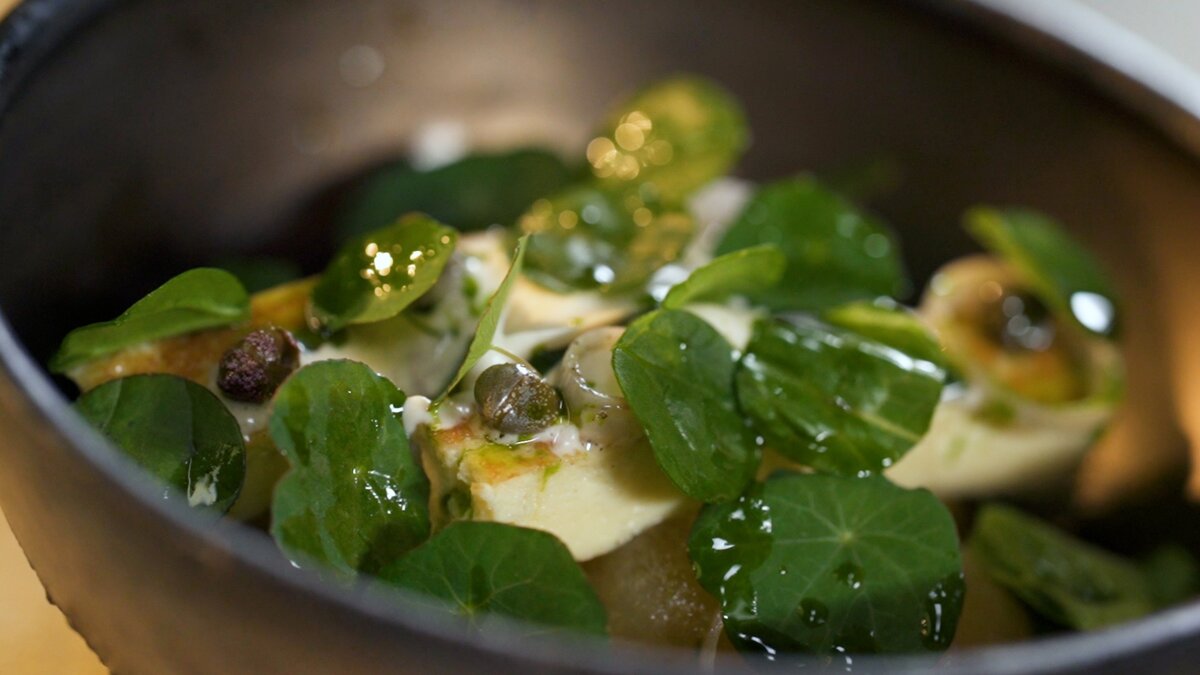 Начальный этап – это приготовления омлета: в миске нужно соединить яйца, 20 г сливок, тертый пармезан, приправить солью и перцем. Далее масса перемешивается до однородной консистенции, перекладывается в вакуумный пакет и помещается в кипящую воду на 10 минут. После этого омлет остужается и нарезается на ровные пласты. Для обжаривания на сковороде потребуется сливочное масло, в которое помещаются кусочки омлета, чтобы подрумянить их с обеих сторон, добавив чеснок, тимьян и каперсы для аромата, сообщает Дзен-канал "Повара на колесах".