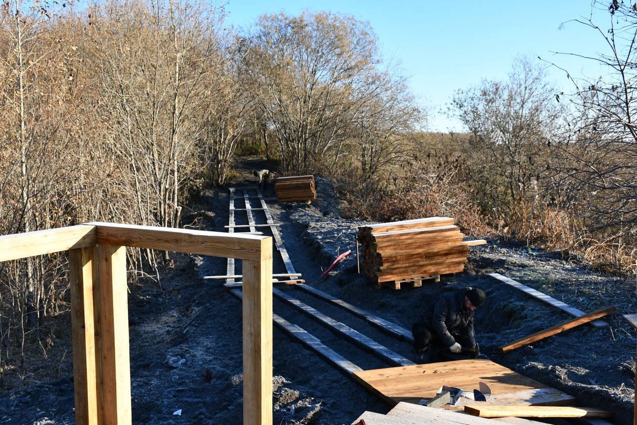 Уже отсыпали территорию и уложили более 100 метров дощатого настила. В ближайшее время ожидают поставку опор освещения для завершения благоустройства.