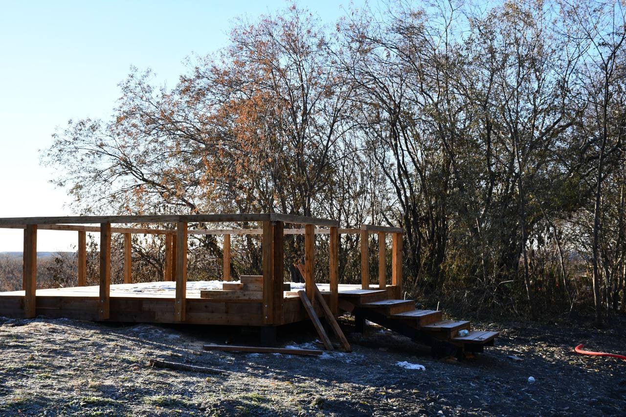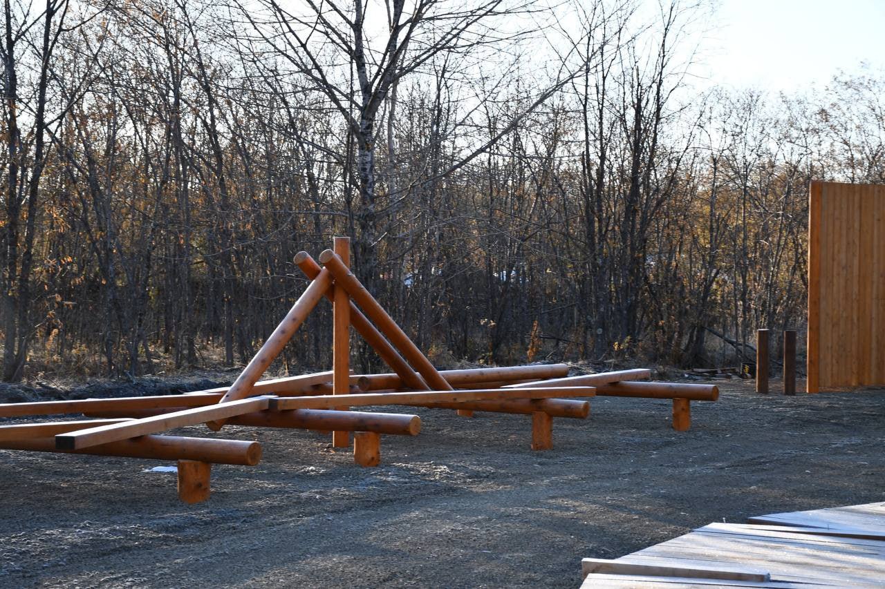 Монтаж полосы препятствий и смотровой площадки завершают в зоне отдыха «Рефулеры» в Поронайске