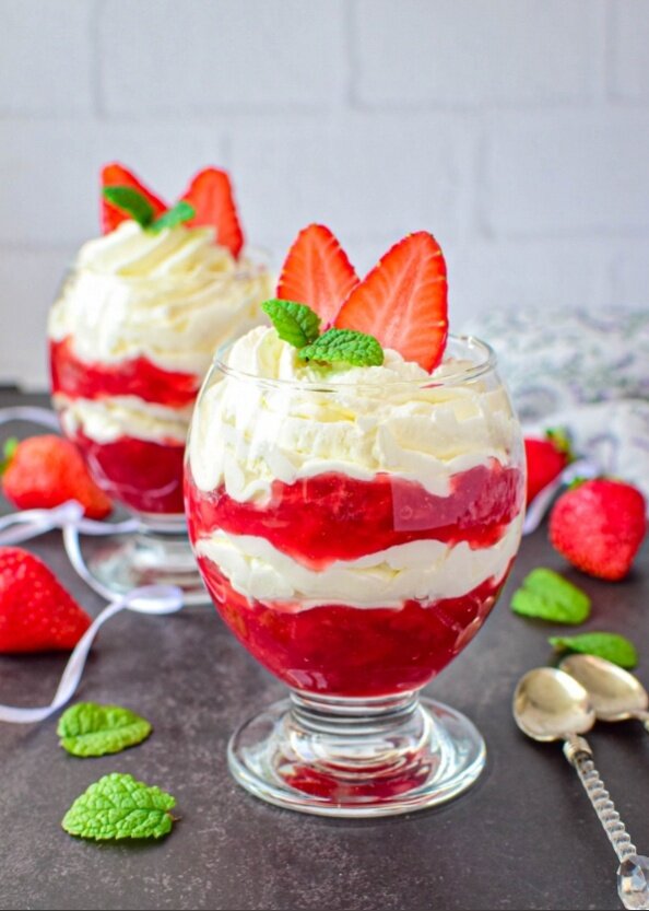 Сборка десерта: В креманки выкладывать слои: сначала клубничную начинку, затем слой творожного крема. Повторить, завершив украшением с крема. Для финального акцента можно использовать свежие ягодки и мяту.