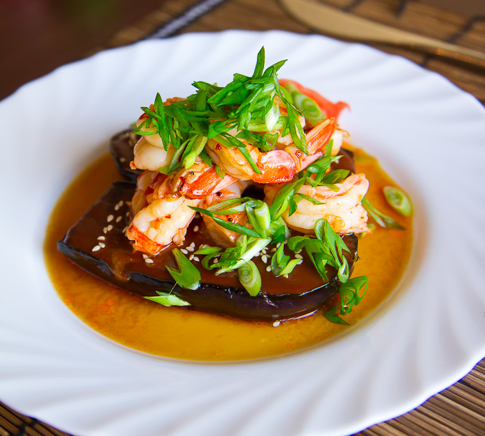Для завершения блюда баклажаны выкладывают на тарелку, посыпают кунжутом и добавляют креветки с соком, который остался на сковороде. Сбрызнув всё комбинацией соевого соуса и лимонного сока, можно украсить зелёным луком. Это яркое и аппетитное блюдо будет прекрасно смотреться на белой посуде и станет настоящим украшением любого стола.