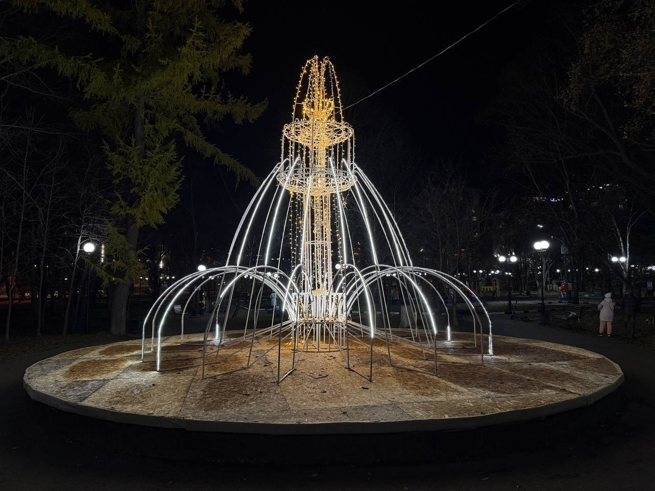 В городском парке устанавливают праздничную иллюминацию.