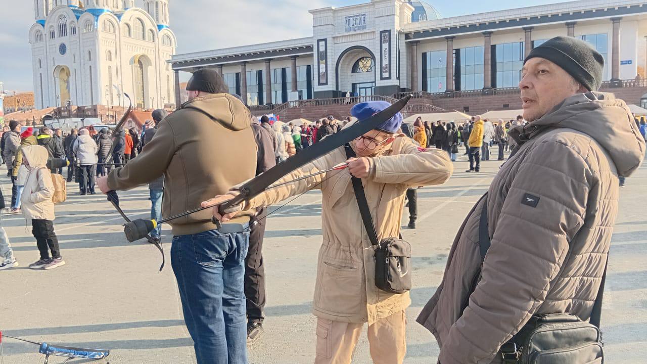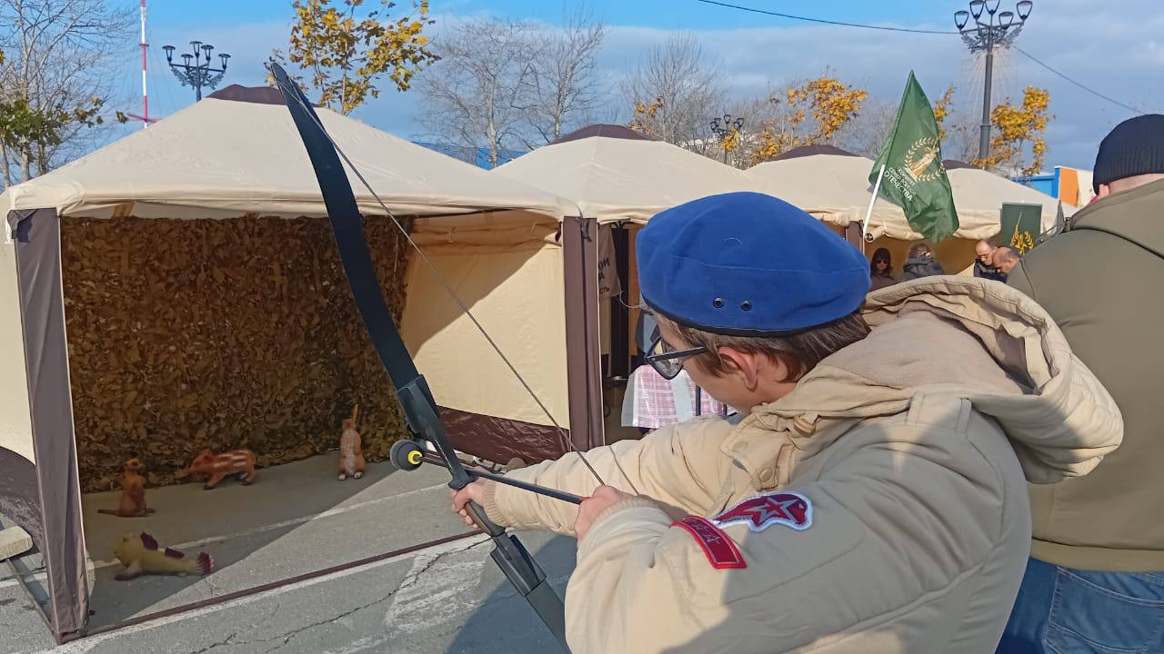 Сейчас жители и гости города принимают участие в мастер-классах. К примеру, один из них - стрельба из лука.
