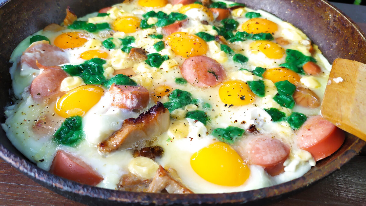Соблюдая простоту, можно создать настоящий кулинарный шедевр. Овощи, фрукты и остатки мяса, например, шашлыка, могут стать основой для приготовления аппетитной яичницы, которая на завтрак станет ярким приветом из природы.