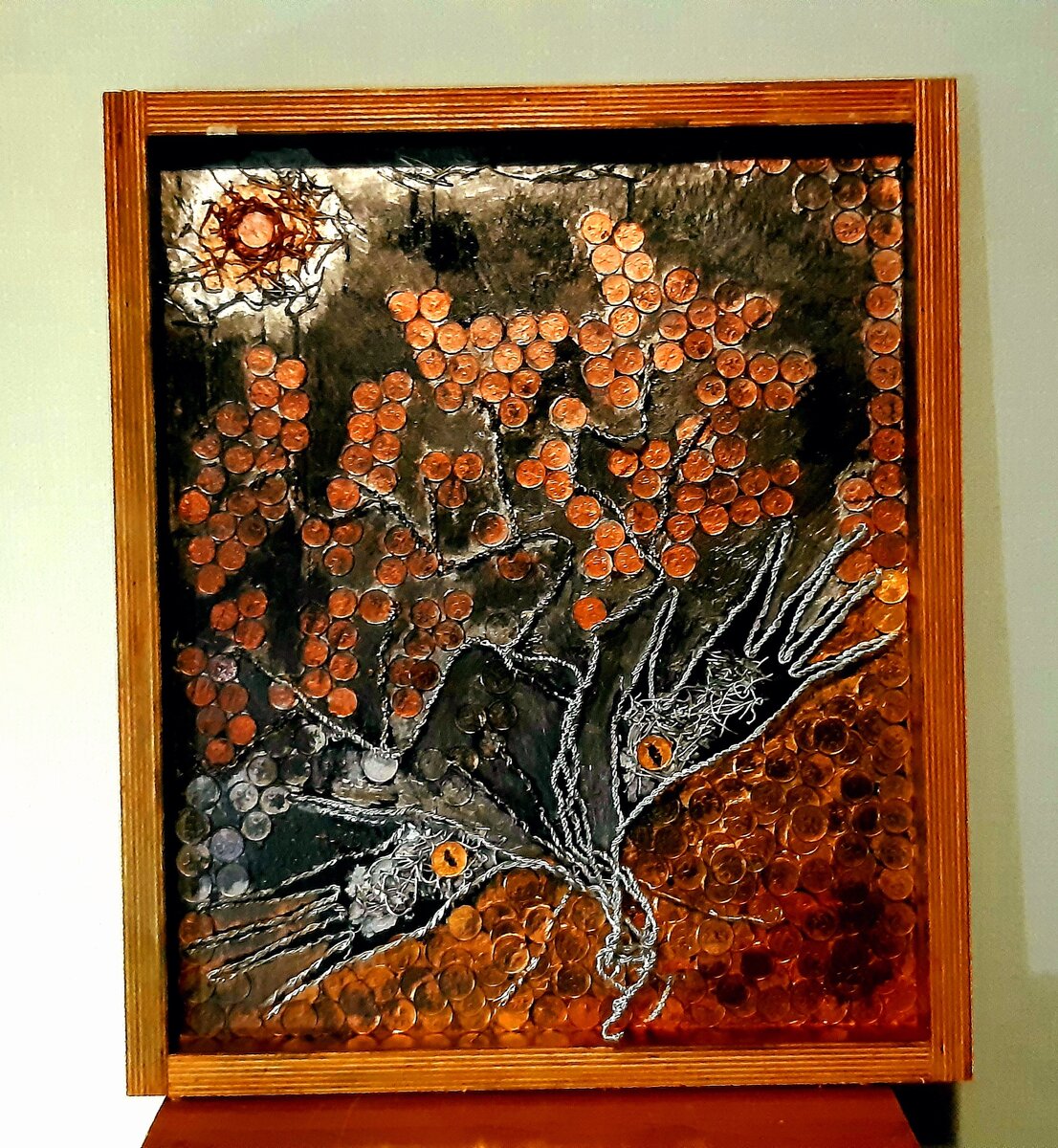 - При помощи проволоки зафиксировать монеты и дополнительно украсить панно с помощью красок.