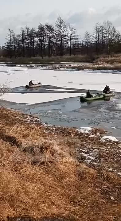 Более десятка человек на резиновых лодках проползли по слабому льду на несколько метров от берега и вытаскивают рыбку. Сообщается, что действие происходит на реке Джимдан в Ногликском районе. Риска провалиться в воду нет, если только острый ледовый край не пробьёт борт плавсредства.