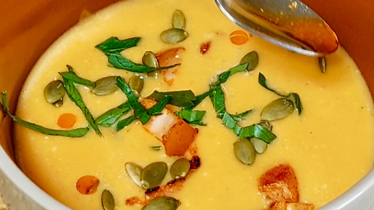 Перед подачей нарежьте варёно-копченую грудинку и быстро обжарьте её на сковороде с добавлением копченой паприки. Готовый суп разлейте по глубоким тарелкам, сверху добавьте обжаренную грудинку, украсив тыквенными семечками и свежей зеленью. Этот нежный, ароматный суп станет настоящим хитом на вашем столе.