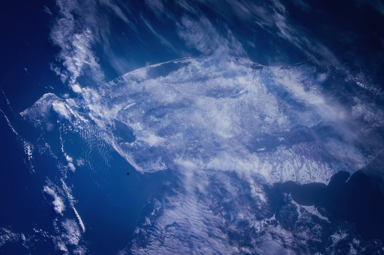 По его словам, с высоты орбиты остров напоминает изумруд, окруженный водами Охотского и Японского морей. Четко видны заснеженные горные хребты, живописные бухты и равнины, где встречаются три стихии — ветер, море и горы.