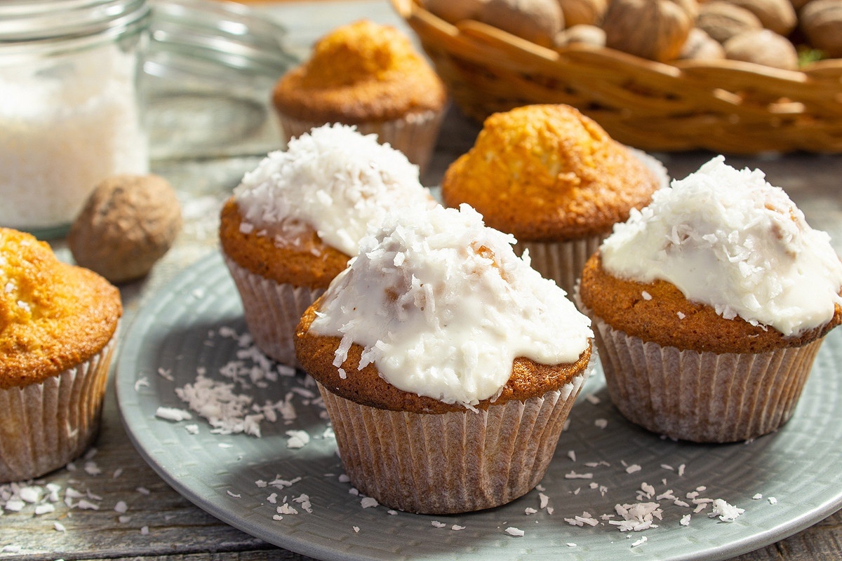 Кокосовые капкейки — это не просто десерт, это настоящее кулинарное искусство, способное поднять настроение и добавить романтики к любому чаепитию. Эти маленькие кексы проникнуты нежным кокосовым ароматом, который греет душу и радует сердце. Добавление грецких орехов к тесту придаёт интересную текстуру и вкус, что делает угощение ещё более привлекательным для любителей сладостей, пишет Дзен-канал "Рецепты на каждый день".