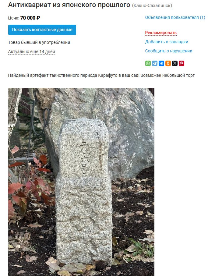 Найденный на Сахалине старинный японский столбик выставили на продажу в интернете
