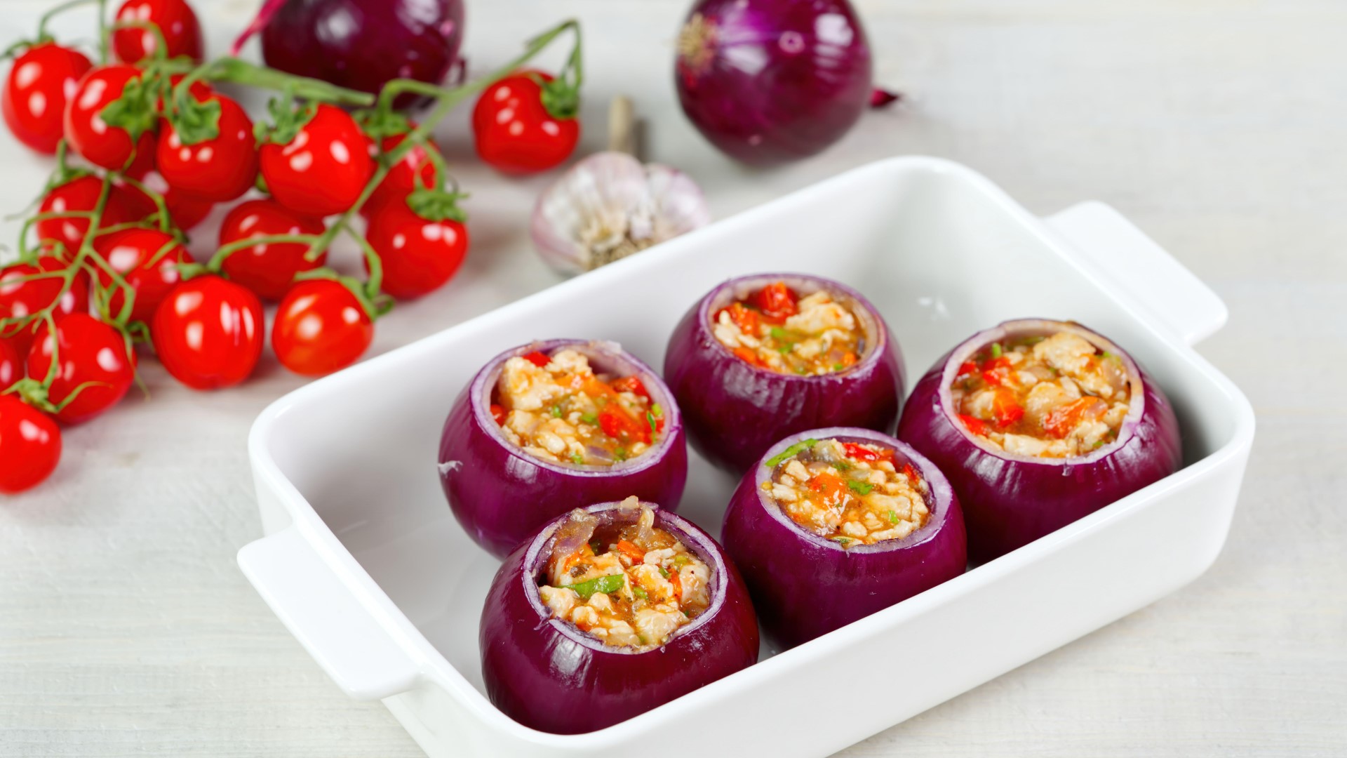 У неочищенного лука срежьте верх и дно, проварите его в кипящей воде 10 минут и остудите. Луковый отвар не выливайте — он еще пригодится. Сварите рис. С остывших луковиц снимите верхнюю кожицу, чайной ложкой аккуратно выньте середину и порубите ее.