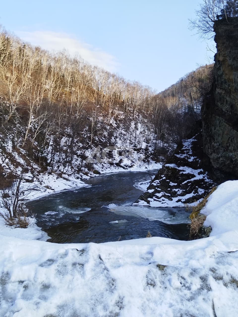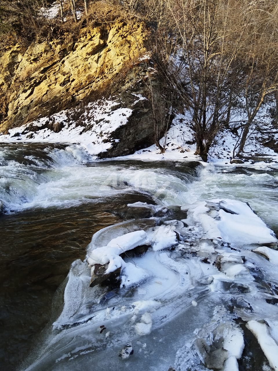 До самих порогов сейчас рекомендуют идти не по крутому спуску с перилами (там очень скользко), а в обход по лесной тропе - пока её не замело снегом, проход свободный.