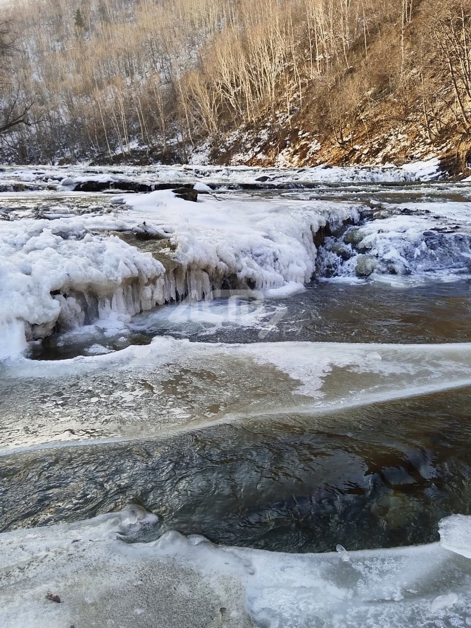 Завораживает: Быковские пороги на Сахалине к зиме обрастают ледяными "сталактитами"