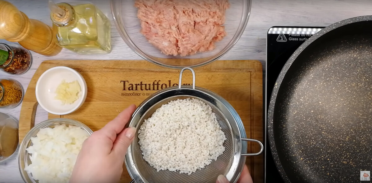 Начнем с риса. Для достижения идеальной текстуры рекомендуется тщательно промыть 100 граммов крупы и оставить замачиваться на ночь. Утром просто слейте воду через дуршлаг — рис готов к дальнейшему использованию.