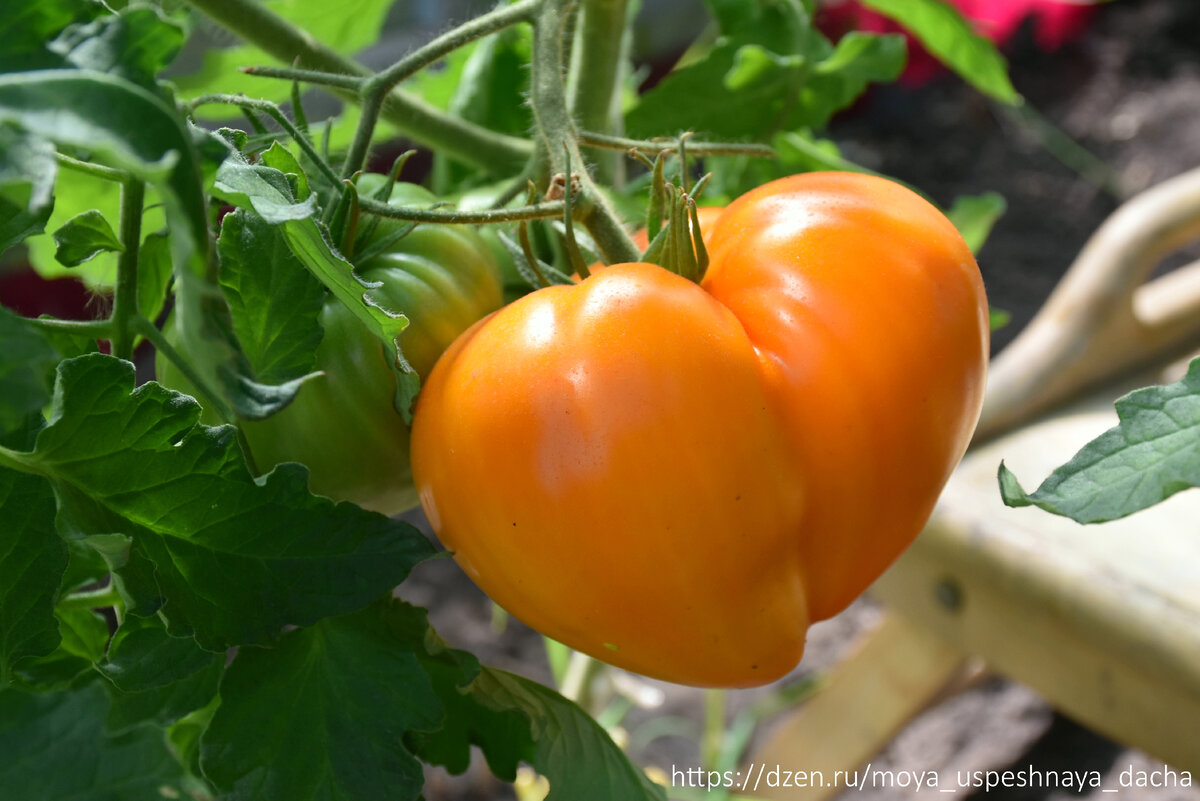 В период цветения кусты формируют от 6 до 8 цветочков, из которых завязывается от трех до пяти плодов, что позволяет избежать перегрузки растения. Плоды имеют характерную сердцевидную форму и являются золотисто-оранжевого цвета. Их масса варьируется от 200 граммов, достигая даже 450 граммов в отдельных случаях, что делает «Золотой гребешок» по-настоящему впечатляющим для любителей крупных томатов.