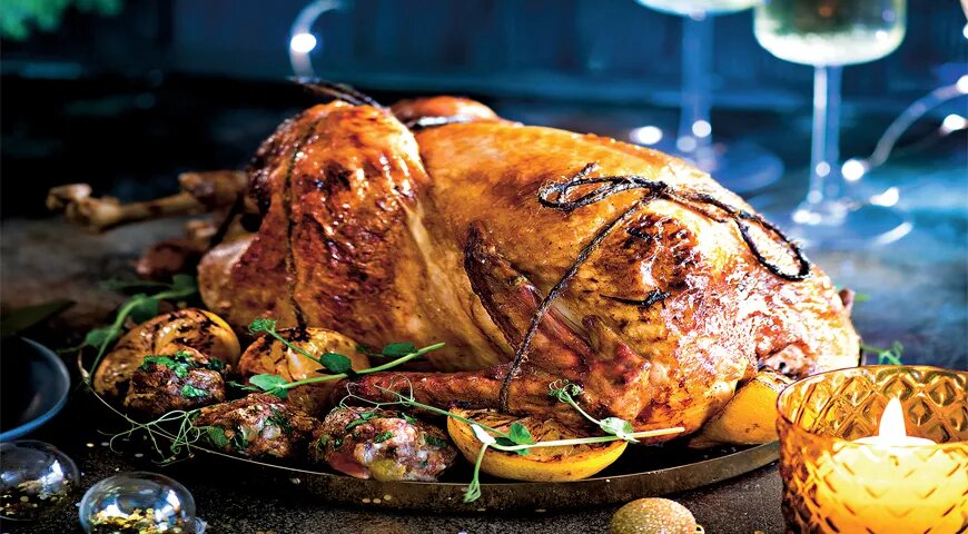 - Индейка с финиками, яблоками и ржаным хлебом: традиционное блюдо, которое будет главной звездой на столе. Подготовьте индейку весом около 3-4 кг, с добавлением ароматных специй и фарша из желудка.