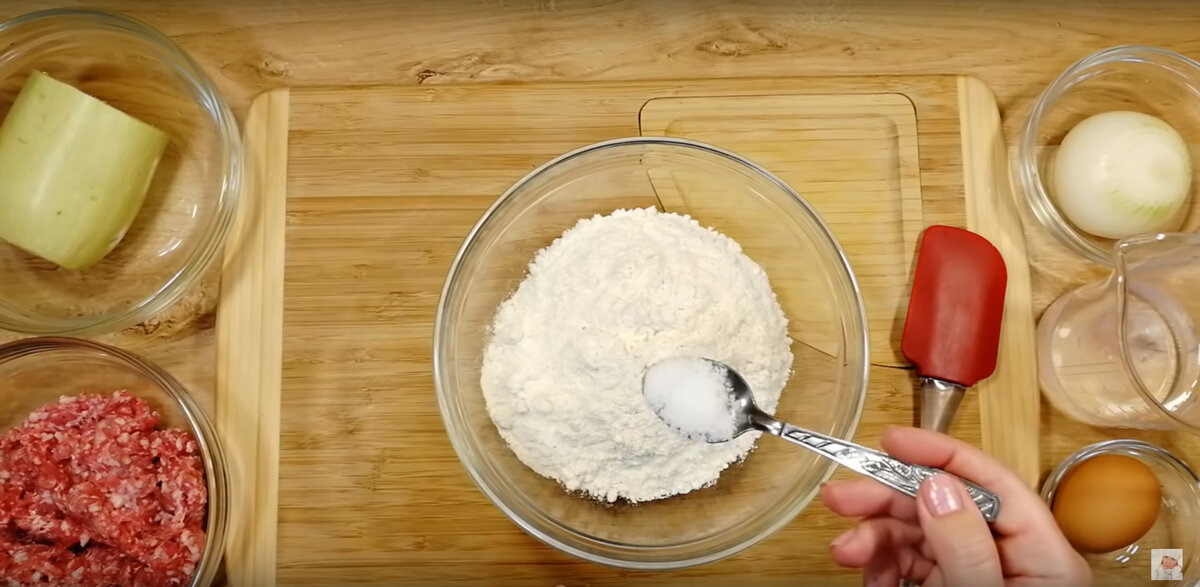Кабачок натирают на крупной терке и посыпают солью, чтобы убрать лишнюю влагу. Лук нарезают полукольцами, добавляют немного сахара и соли, затем хорошенько перетирают. Фарш слегка солят, добавляют молотый черный перец и немного чили. После этого все ингредиенты соединяют и перемешивают.
