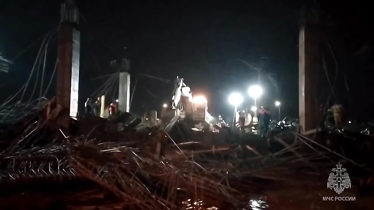 Сотрудники МЧС продолжают разбор разрушенных конструкций здания. Работы ведут как вручную, так и при помощи тяжелой техники.